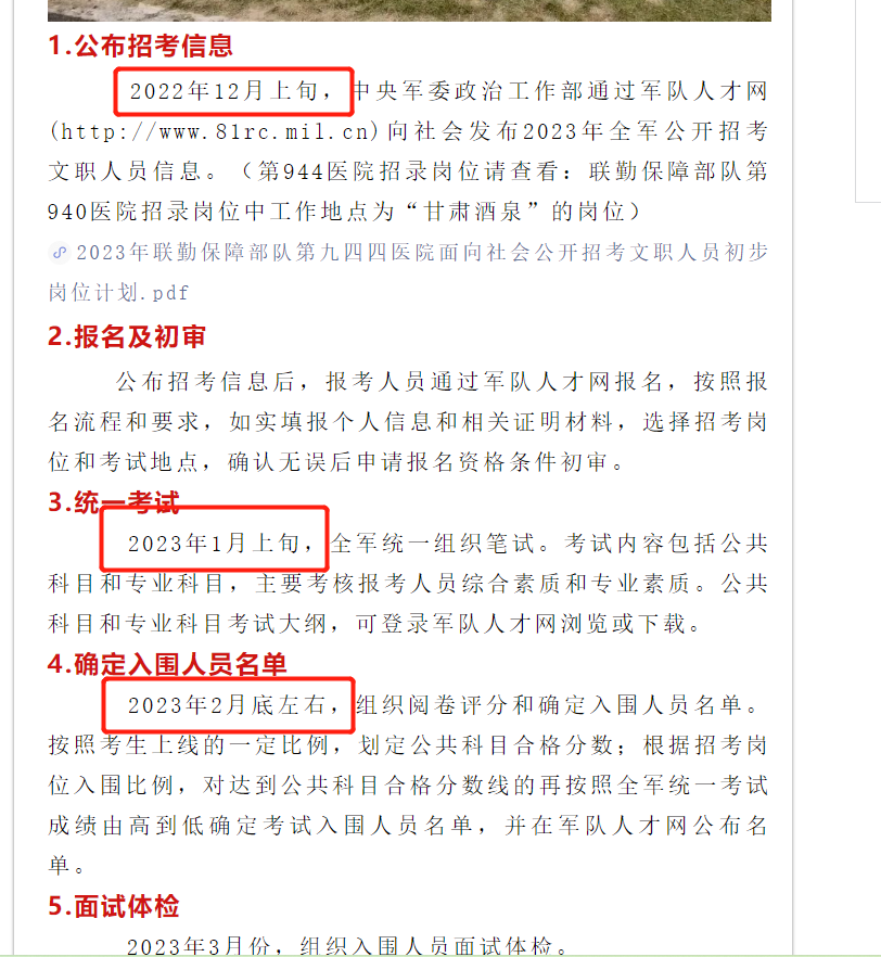 2023年2月底左右,组织阅卷评分和确定入围人员名单。按照考生上线的一定比例,划定公共科目合格分数;根据招考岗位入围比例,对达到公共科目合格分数线的再按照全军统一考试成绩由高到低确定考试入围人员名单,并在军队人才网公布名单。