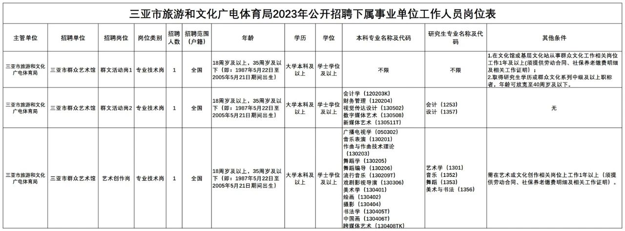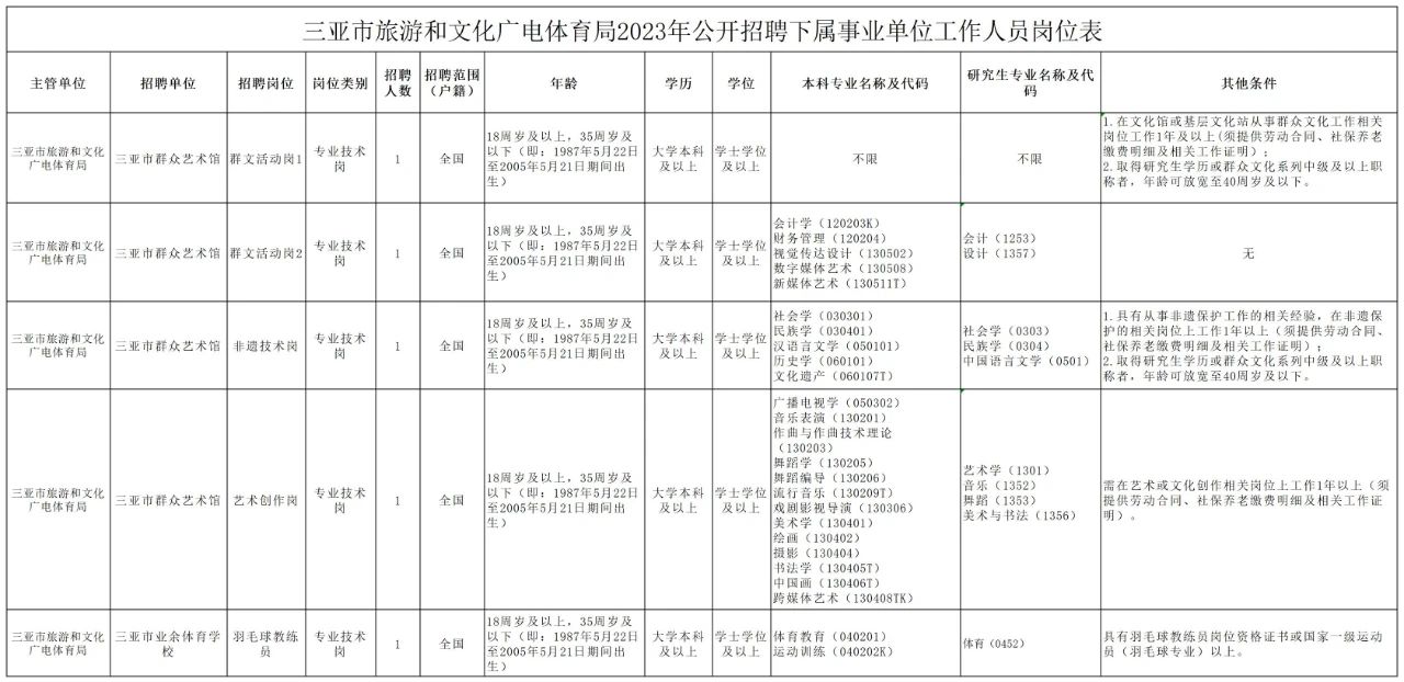 三亚市群众艺术馆公开招聘事业编制工作人员4名,三亚市业余体育学校公开招聘事业编制工作人员1名,招聘的具体岗位、专业等要求详见《三亚市旅游和文化广电体育局下属事业单位公开招聘工作人员岗位表》(附件1)。