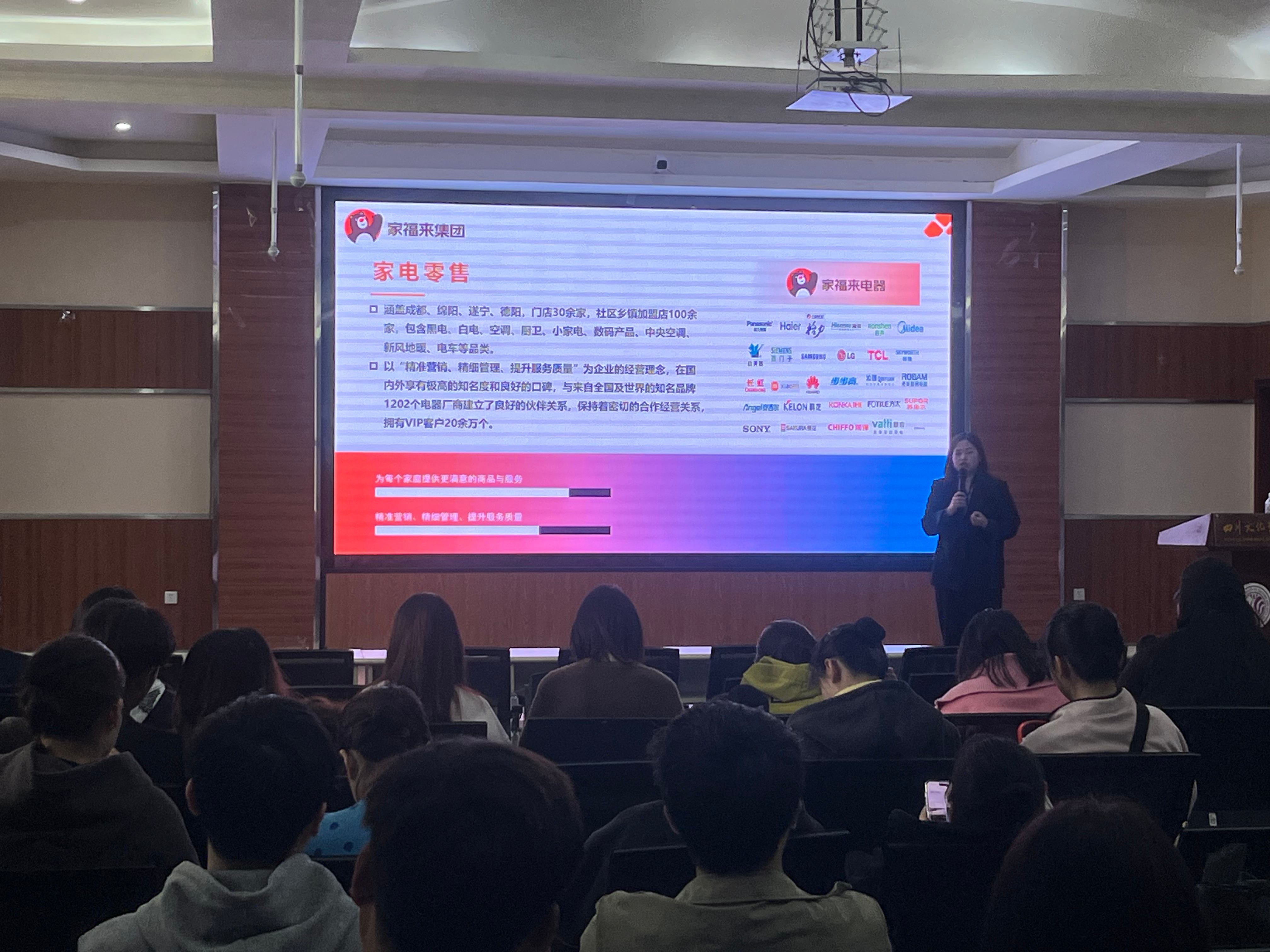 宣讲会上,四川家福来实业集团校园招聘负责人何青莲详细介绍了单位的发展历程、业务布局、人才需求与岗位发展潜力,同时就学生的假期实习实训等问题进行了详细解答。