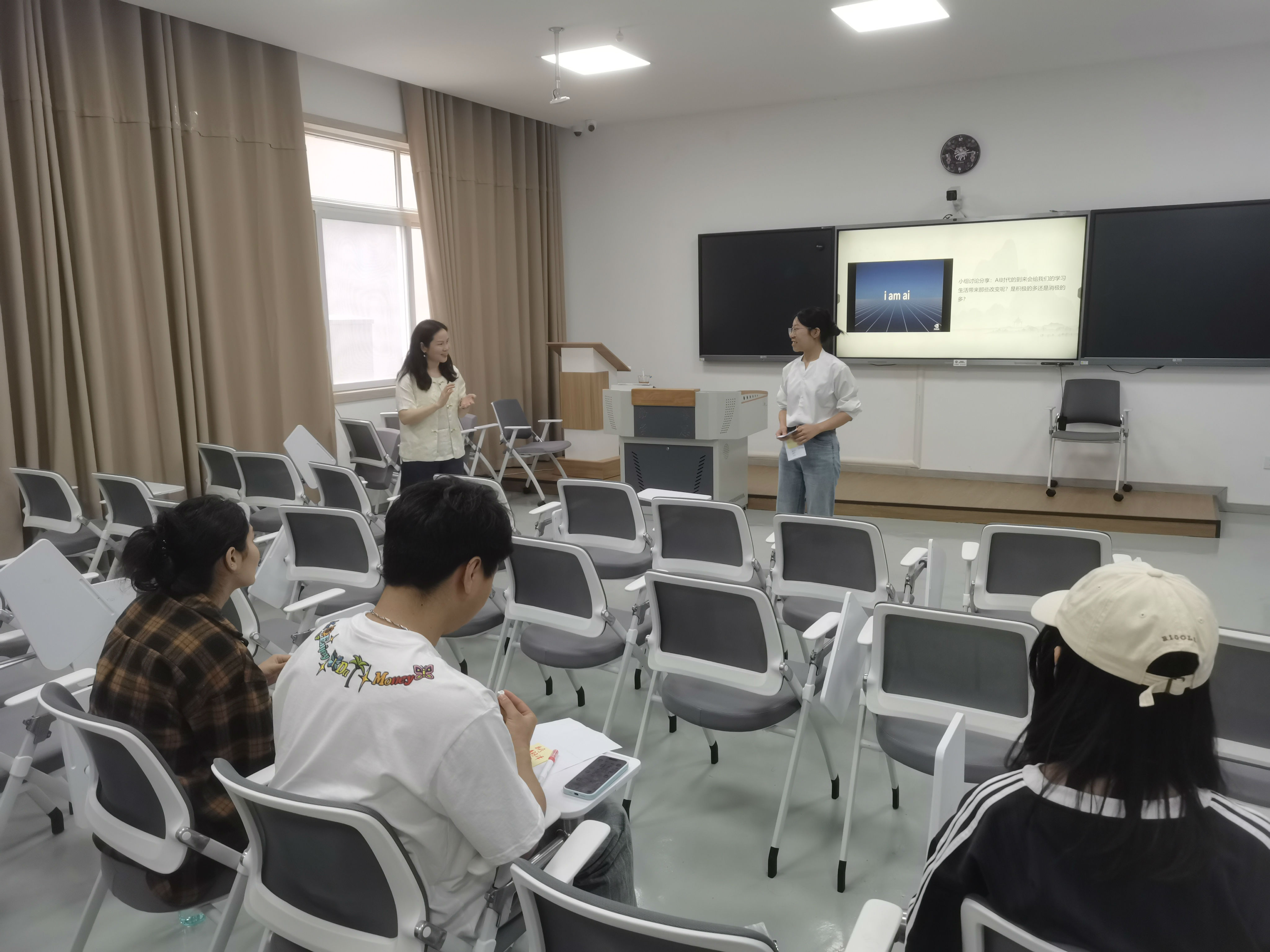 小组讨论环节将课堂推向高潮。学生围绕“AI时代对学习生活的影响”展开热烈思辨,从效率提升、教育模式变革等积极面,延伸至隐私安全、人类技能替代等挑战,在思维碰撞中深化对“势”的理解。