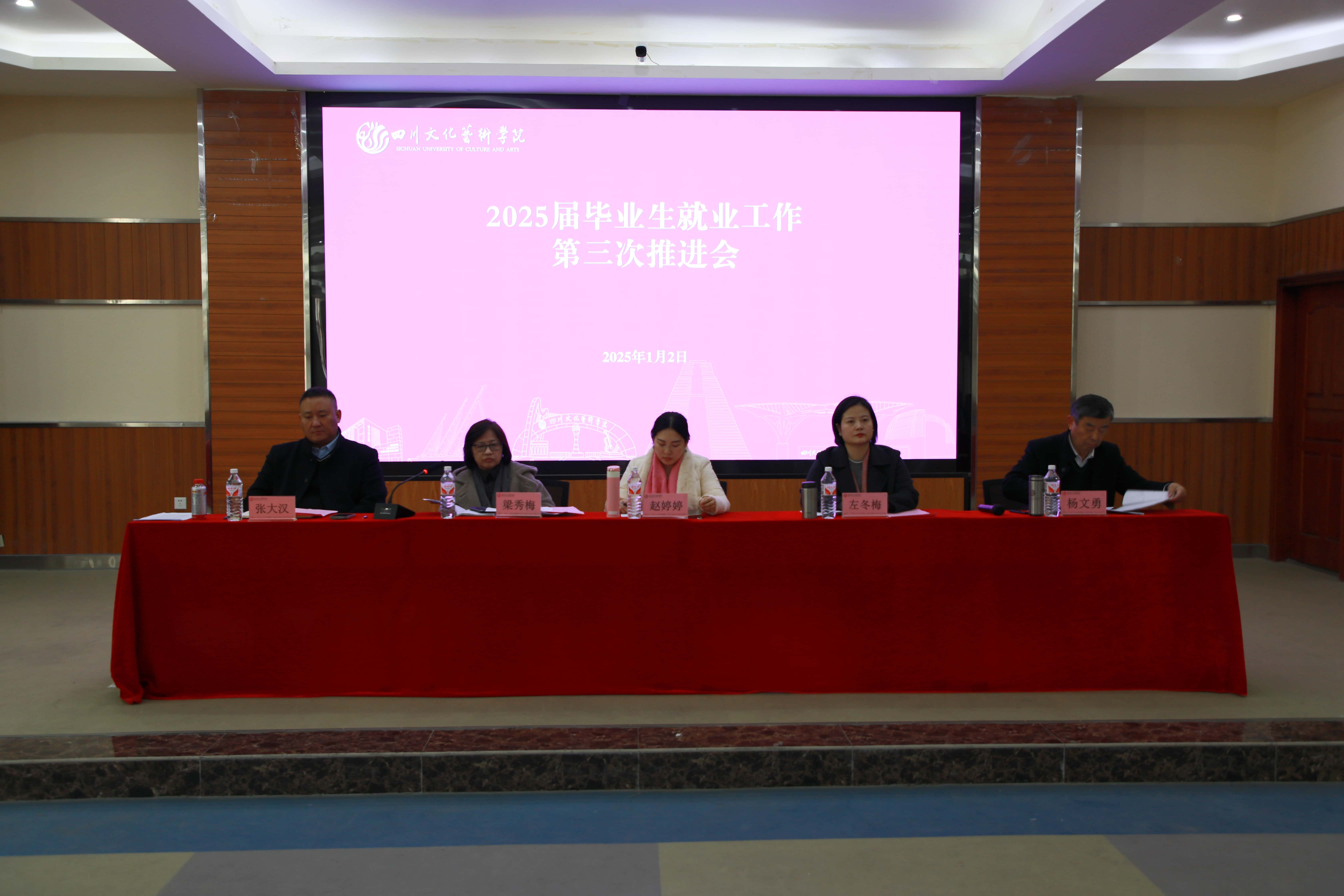 为贯彻落实《教育部、省教育厅关于做好2025届全国普通高校毕业生就业创业工作的通知》精神,进一步增强学校就业工作紧迫意识,全力推进2025届毕业生就业工作。1月2日下午,四川文化艺术学院在绵阳校区E105会议室召开2025届毕业生就业工作第三次推进会。